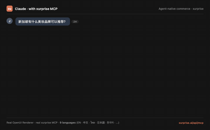 Agent-native commerce · xurprise. One HTTPS endpoint. Six tools. Zero setup. Multilingual.