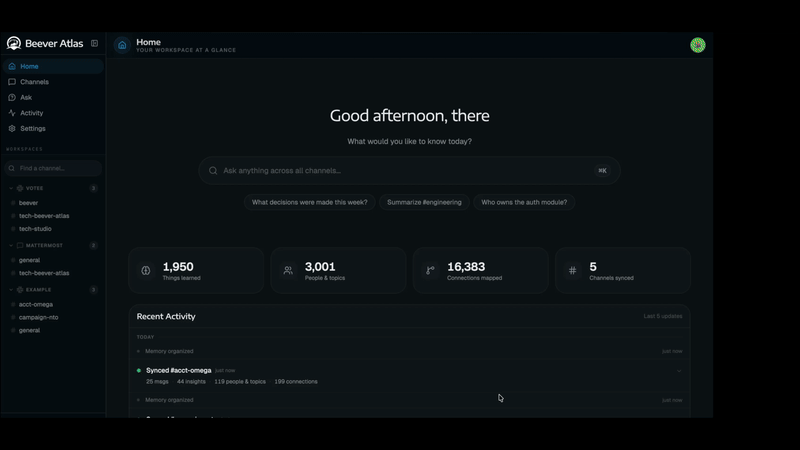 Beever Atlas pulls the conversations your team already has on Slack, Discord, Microsoft Teams, and Mattermost, extracts atomic facts, deduplicates them, and clusters them into topic pages with citations. A graph store links the people, decisions, and projects mentioned across channels. Ask questions in natural language and get answers cited back to the source messages — through the dashboard, or through MCP into Claude Code and Cursor.
