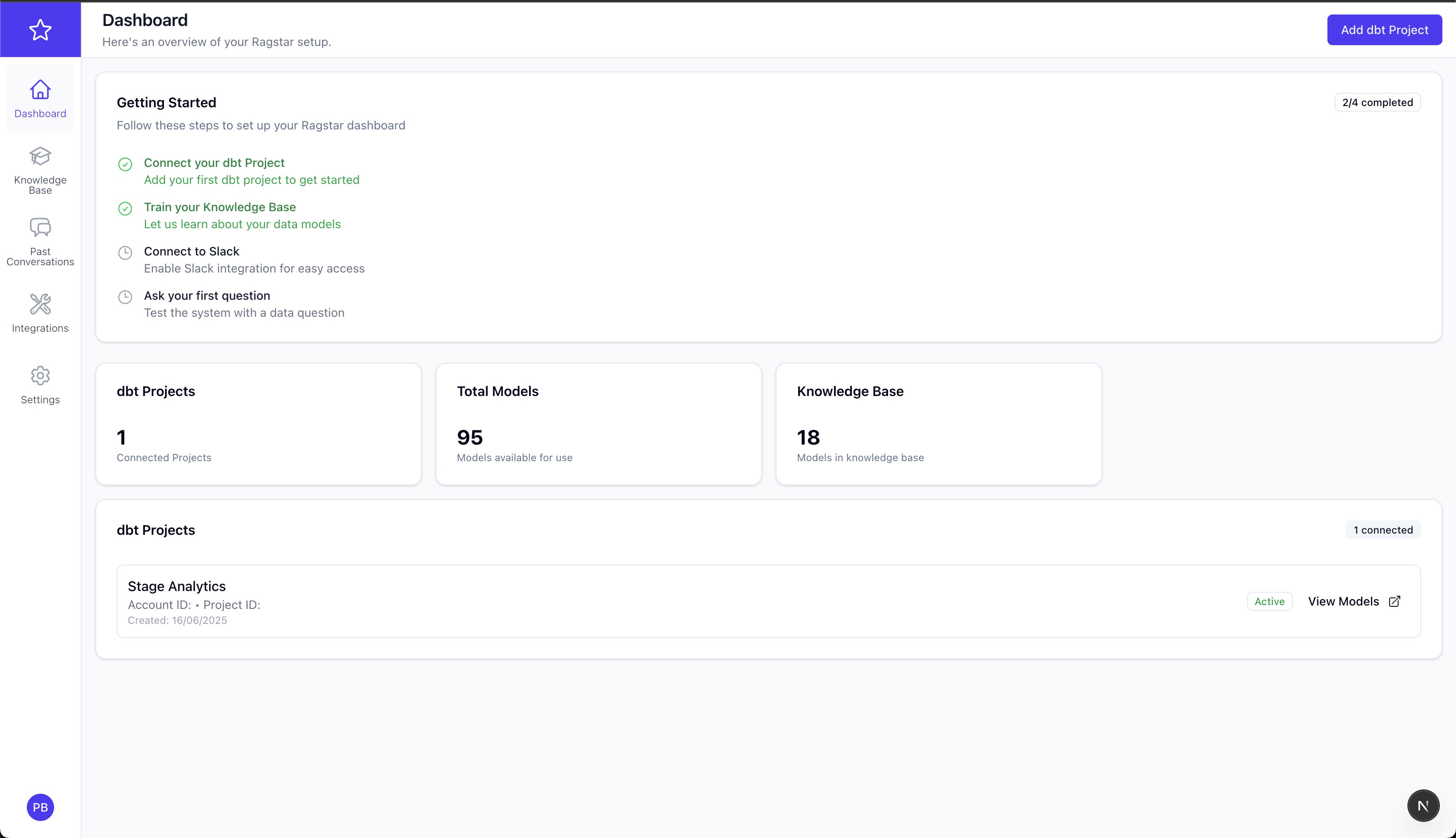 Ragstar connects to your dbt project, builds a knowledge base from models & documentation, and lets everyone ask data-related questions in plain English via a beautiful web dashboard or Slack. Under the hood Ragstar combines:
