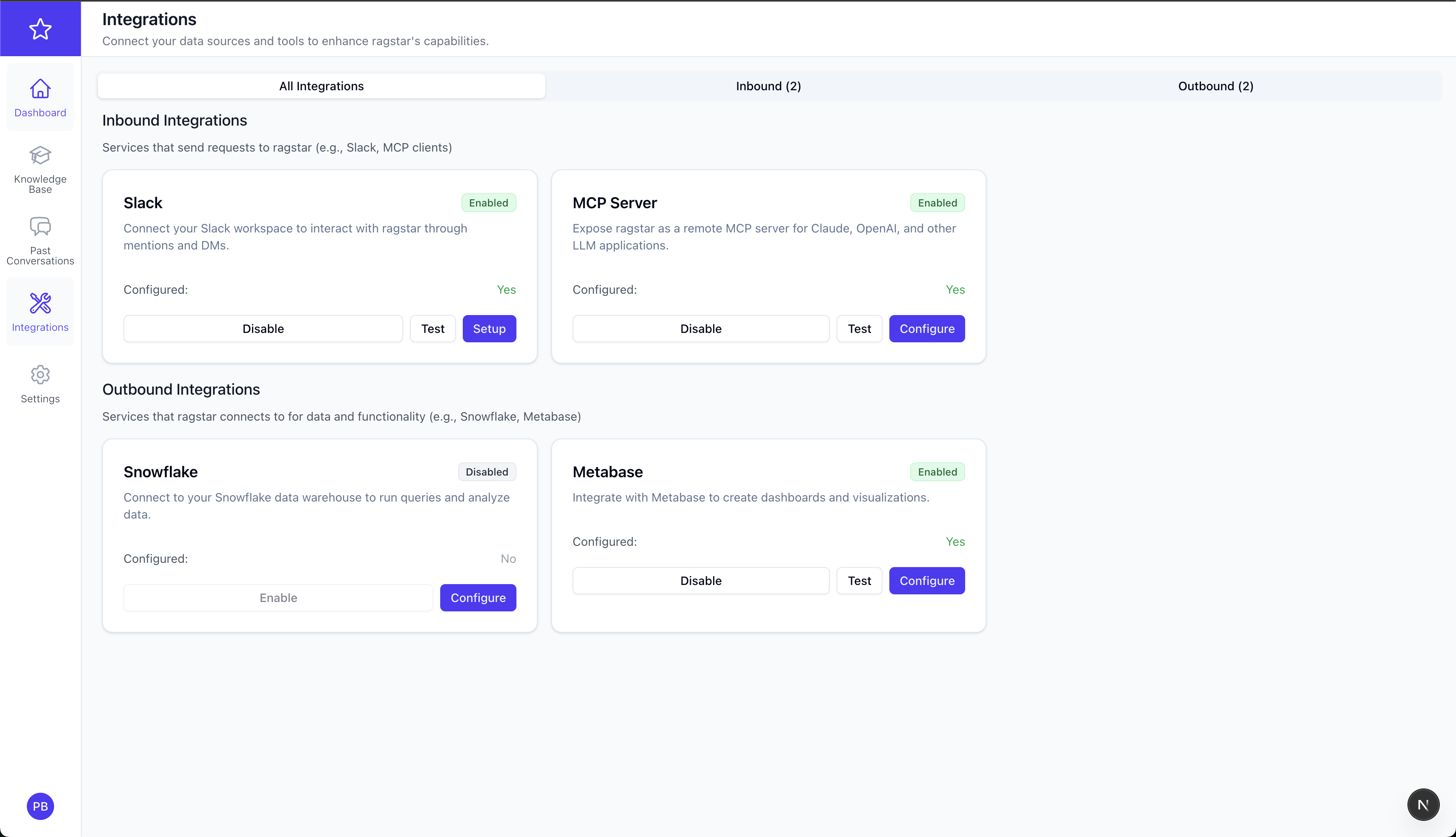 🎉 That's it — open http://localhost:3000, sign up for a new account and you're ready to start using Ragstar.