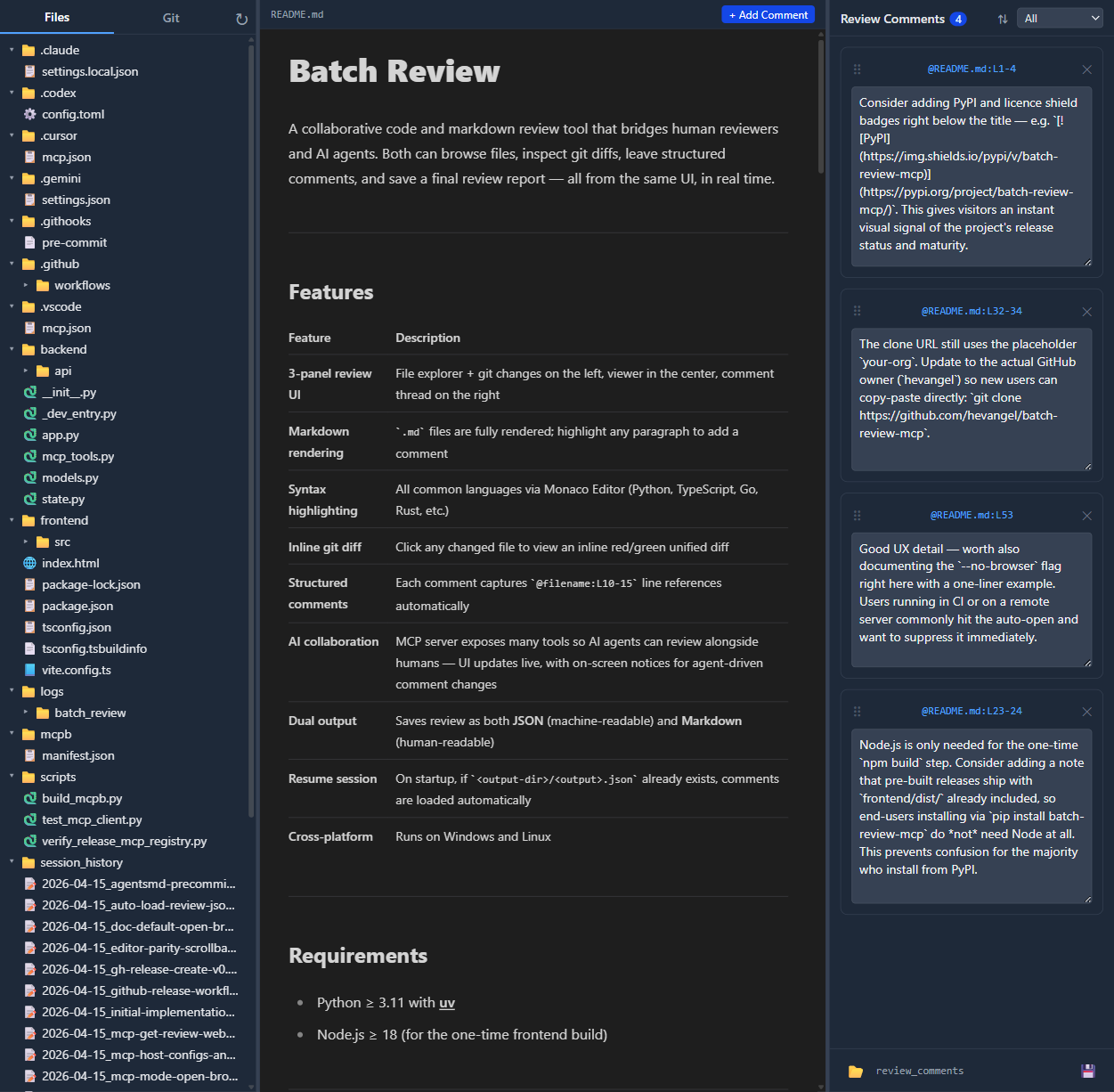 A collaborative code and markdown review tool that bridges human reviewers and AI agents. Both can browse files, inspect git diffs, leave structured comments, and save a final review report — all from the same UI, in real time.