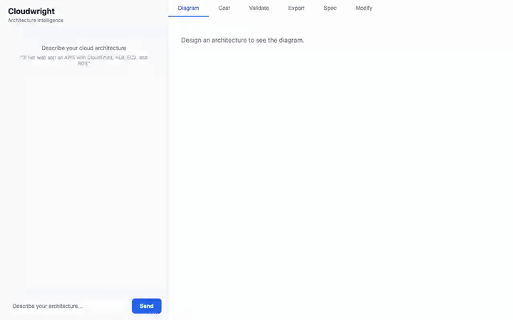 Cloudwright bridges the gap between a whiteboard sketch and deployable infrastructure. Describe a system in natural language, and Cloudwright produces a structured architecture spec, cost estimates, compliance reports, Terraform/CloudFormation code, diagrams, and diffs — all from a single format called ArchSpec.
