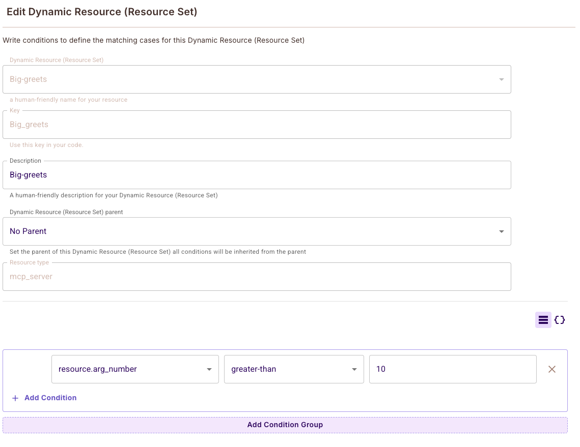 Example: Create dynamic resources with conditions like resource.arg_number greater-than 10 to allow the conditional-greet tool only when the number argument exceeds 10.