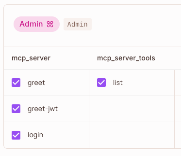 Example: In Permit.io, the 'Admin' role is granted permissions on resources and actions as mapped by the middleware. For example, 'greet', 'greet-jwt', and 'login' are actions on the 'mcp_server' resource, and 'list' is an action on the 'mcp_server_tools' resource.