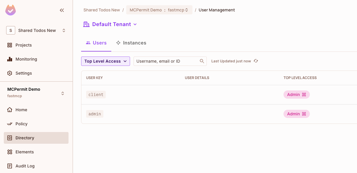 Example: In Permit.io Directory, both 'client' and 'admin' users are assigned the 'Admin' role, granting them the permissions defined in your policy mapping.