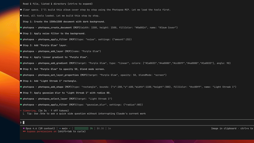 Then start a new Claude Code session and ask it to edit images. The Photopea editor will open in your browser automatically on the first tool call.