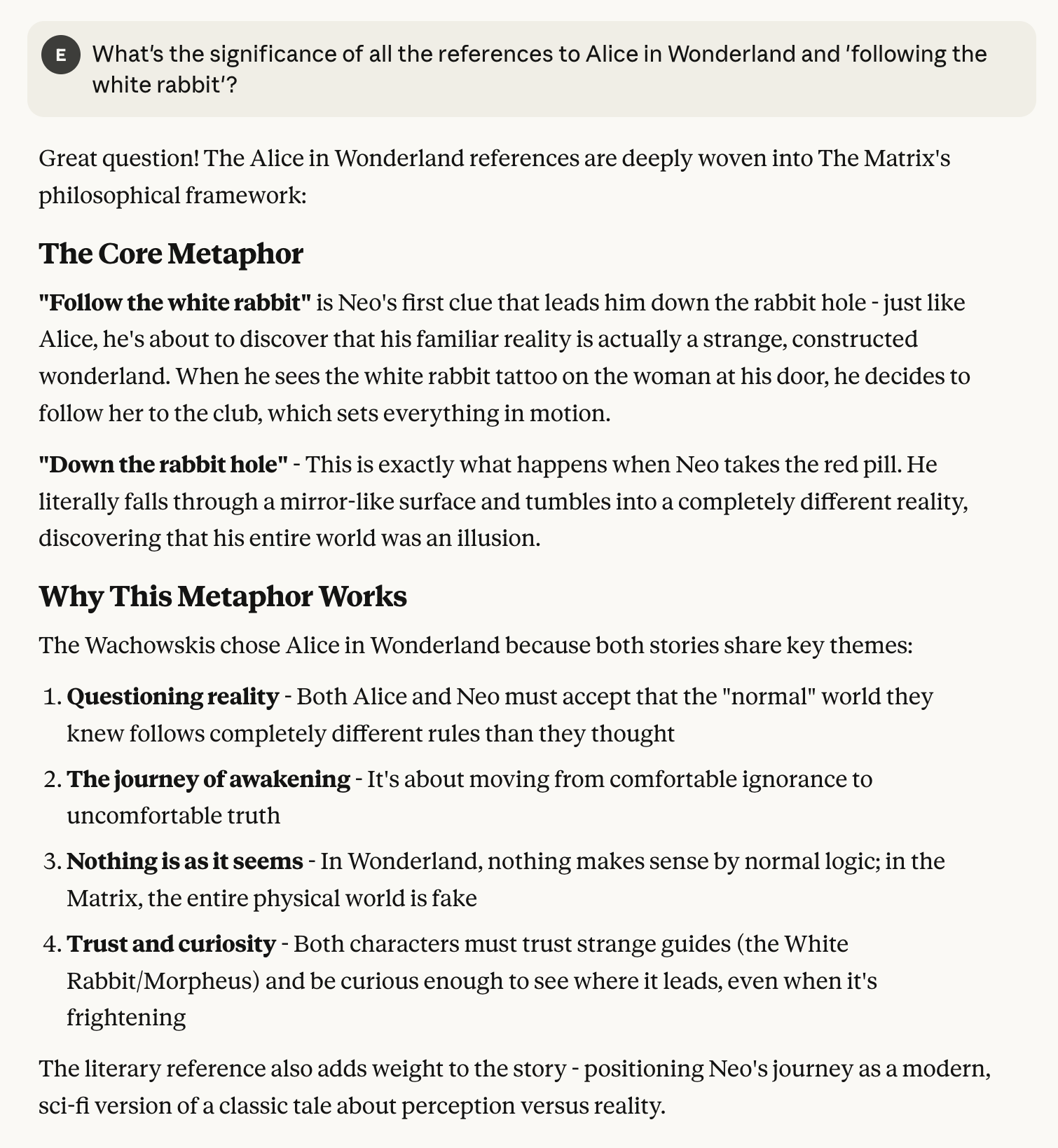 User: What's the significance of all the references to Alice in Wonderland and 'following the white rabbit'?
