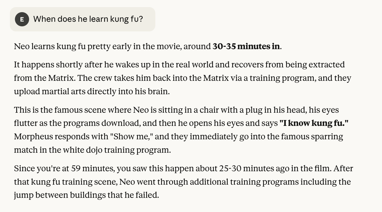 By leveraging OpenSubtitles for real-time subtitle context, the LLM can understand exactly where I am in a film and provide relevant, spoiler-aware responses.