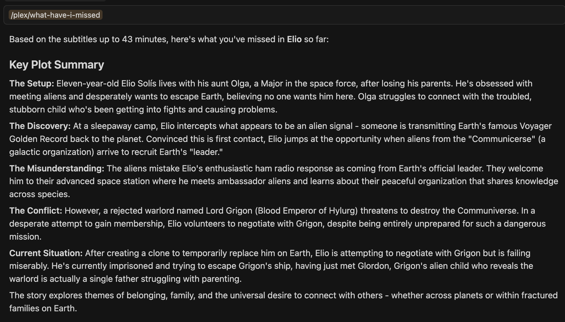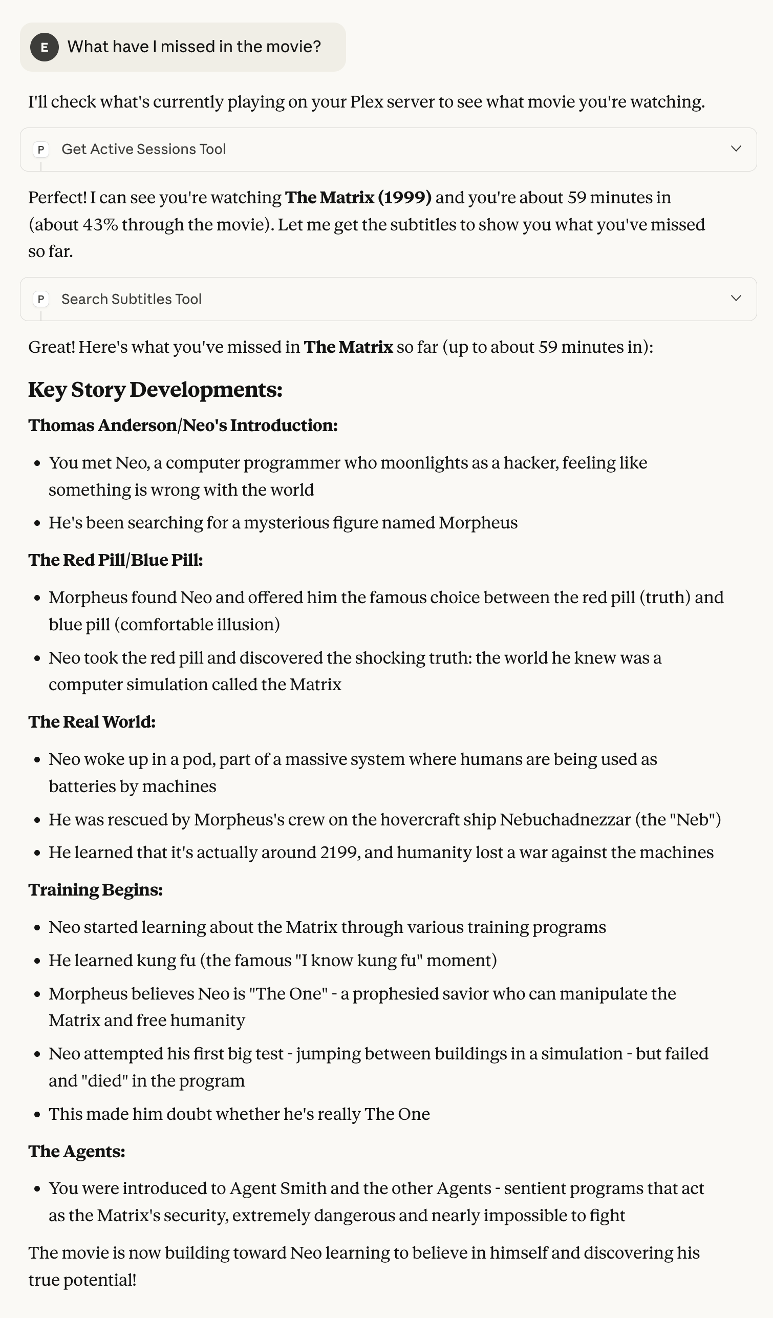 I wanted to experiment with MCP and thought it would be interesting to integrate my Plex movie-watching experience with an LLM. As someone who enjoys deep-diving into films, I often find myself wanting to understand plot points I may have missed or explore deeper context while watching. This project provides real-time context of my current viewing experience through subtitle analysis, allowing me to: