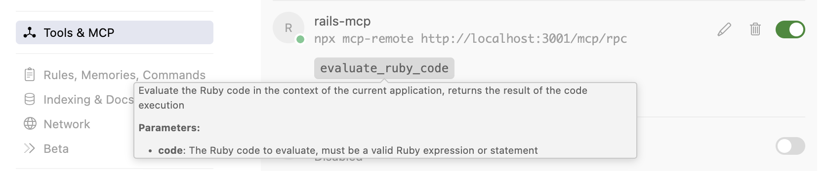 code (string, required): Ruby code to executeAdd to your MCP client configuration (.cursor/mcp.json for Cursor or claude_desktop_config.json for Claude Desktop):