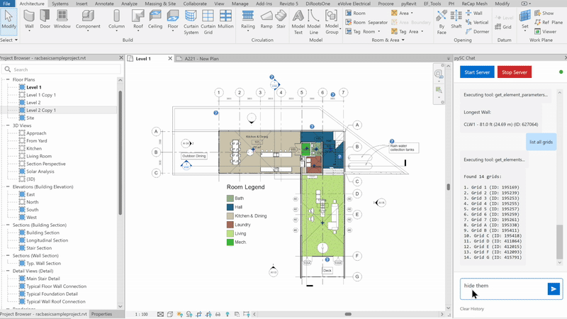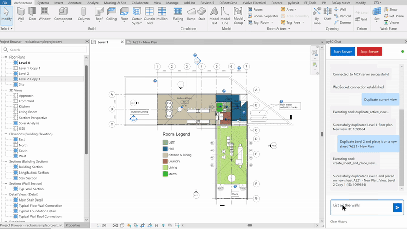 AI chat for Autodesk Revit that lives inside Revit. No Claude Desktop. No external apps. Just a native chat panel, a WebSocket server, and 53+ tools that talk directly to the Revit API.