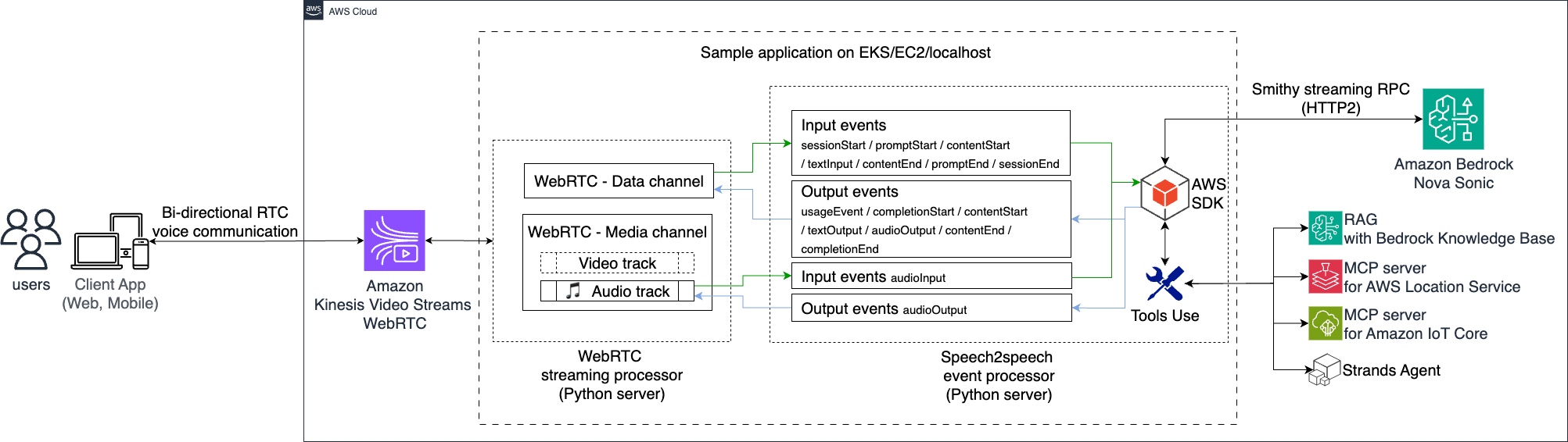 Sample voice agent application based on Amazon Nova 2 Sonic and Amazon Kinesis Video Streams WebRTC service. It demonstrates the real-time audio streaming interaction between user and speech-to-speech model via WebRTC connection. It also supports tool use like RAG with Bedrock Knowledge Base, MCP servers, and Strands agent.