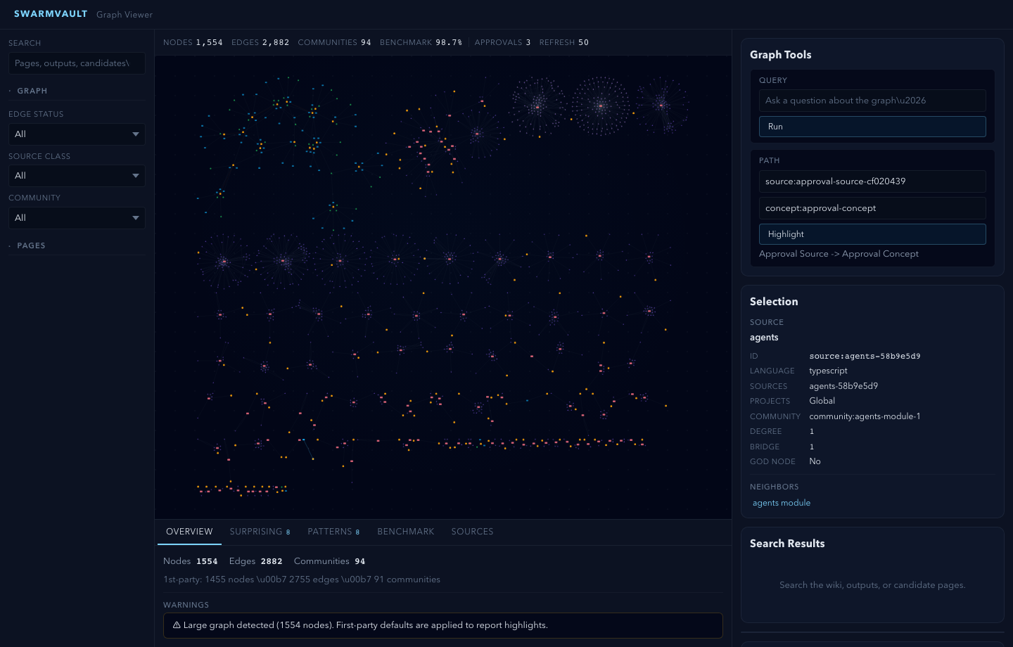 SwarmVault turns the LLM Wiki pattern into a local toolchain with graph navigation, search, review, automation, and optional model-backed synthesis. You can also start with just the standalone schema template — zero install, any LLM agent — and graduate to the full CLI when you outgrow it.
