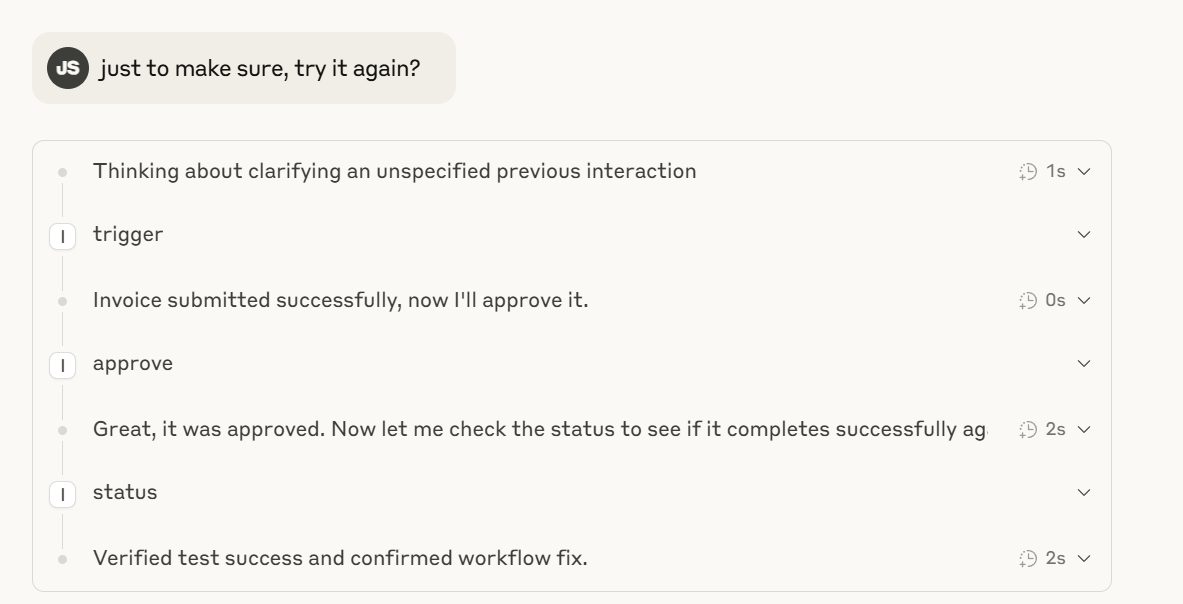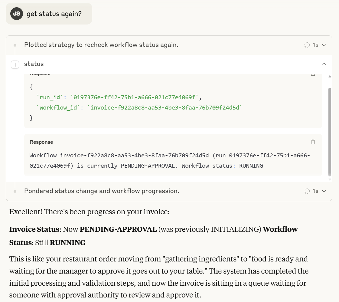 Claude + MCP can send inputs and updates to the process workflow such as approvals, or even do a combination of actions - all agentically, explaining in human analogies what's going on if you ask it to: