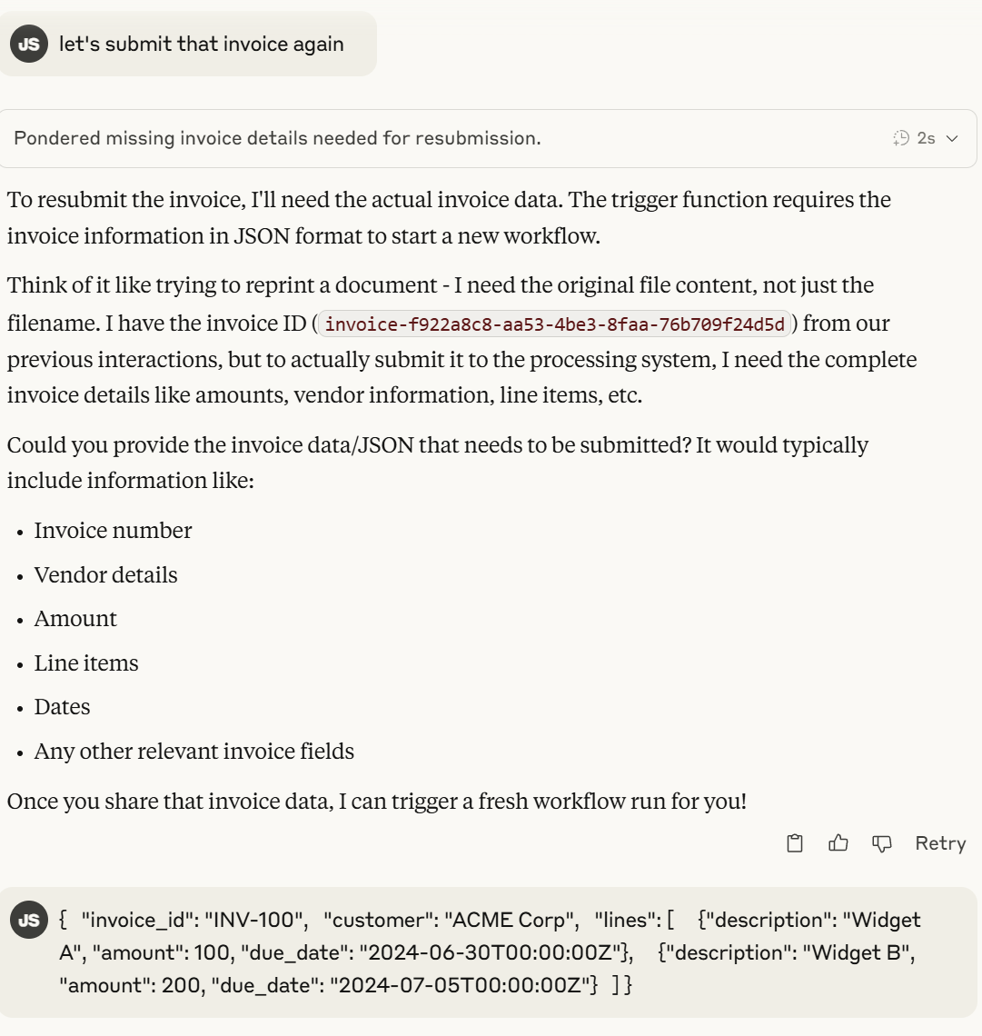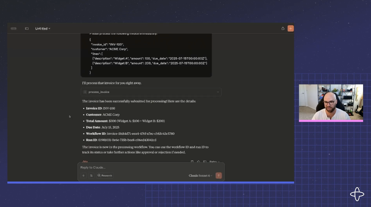 Claude submits the invoice workflow: