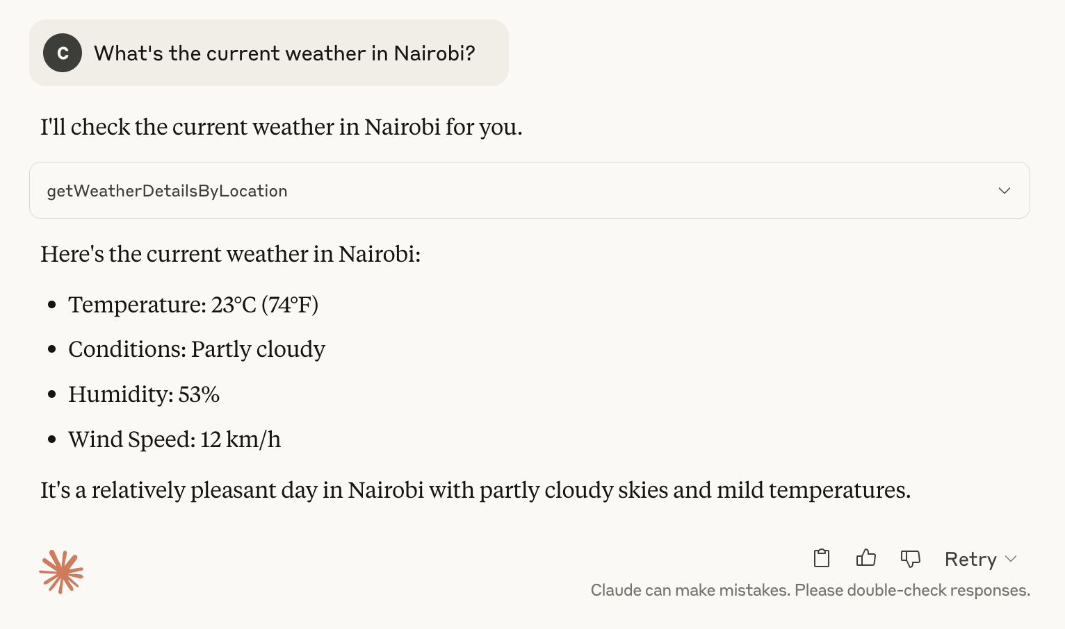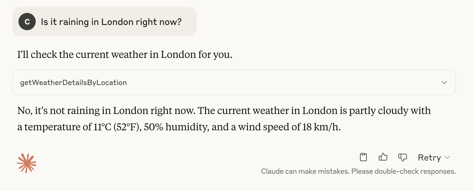 Once connected, you can ask Claude to use the weather tool: