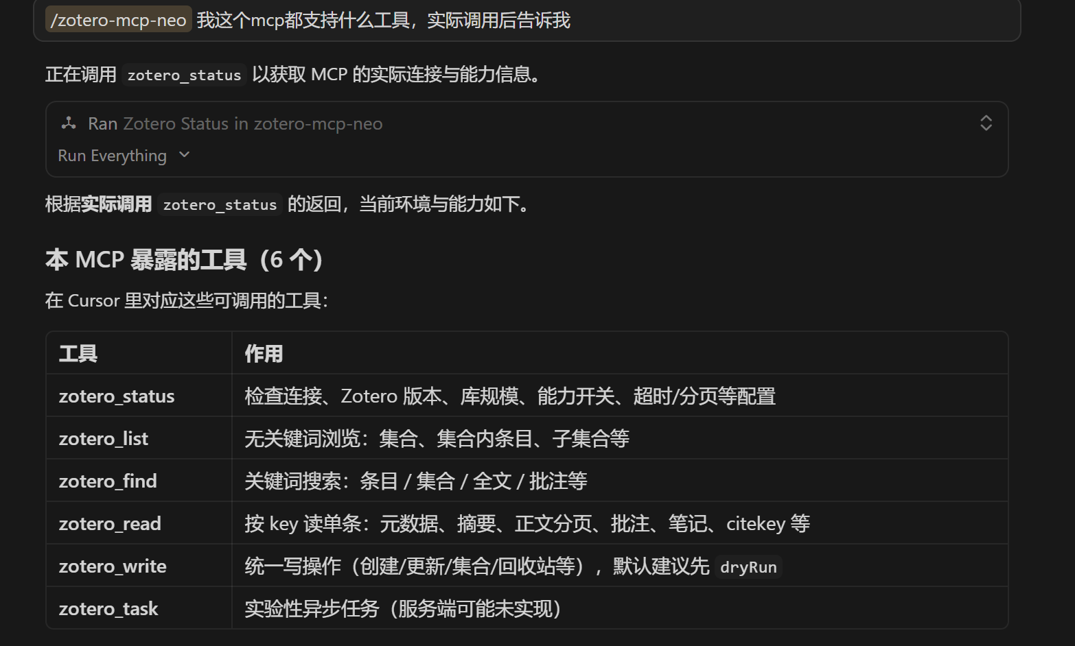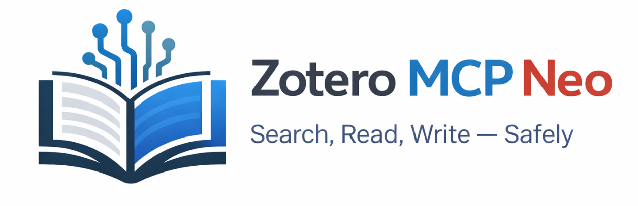 Based on the excellent cookjohn/zotero-mcp. The foundational plugin architecture, search engine, PDF processing, annotation extraction, semantic search, and more all originate from there. Neo builds upon this by consolidating the MCP API into 6 unified tools with a dryRun-first safety model. See Design Philosophy.